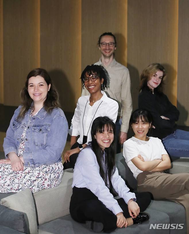 [성남=뉴시스] 조수정 기자 = 카카오엔터테인먼트 웹툰 현지화 담당자들이 26일 경기 성남시 카카오엔터테인먼트에서 뉴시스와 인터뷰 하고 있다. 왼쪽부터 시계방향으로 클레어 가메린(프랑스), 레티샤 웰스(미국.가운데), 조안 아띠아(프랑스.위), 마리사 루키(미국), 문승현(한국), 아나 만조(멕시코). 2022.05.28. chocrystal@newsis.com