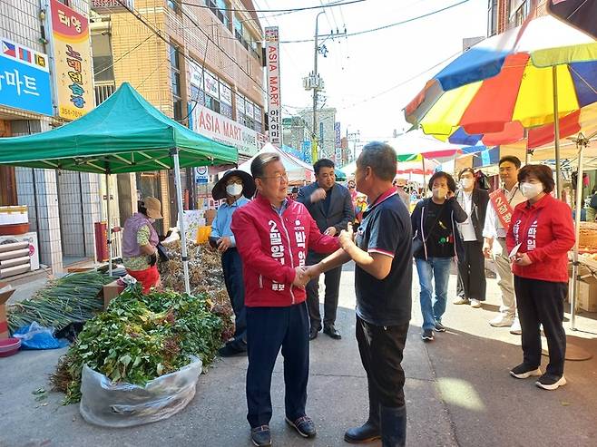 [밀양=뉴시스] 안지율 기자 = 국민의힘 박일호 경남 밀양시장 후보가 28일 밀양시가지 일원을 돌며 시민들에게 지지를 호소하고 있다. (사진=박일호 후보 캠프 제공) 2022.05.22. photo@newis.com