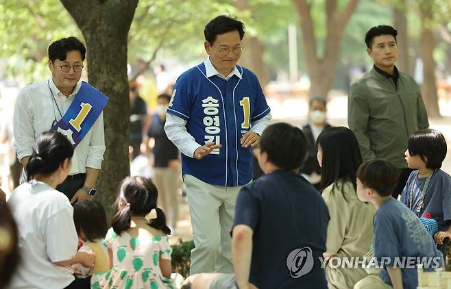 (서울=연합뉴스) 백승렬 기자 = 더불어민주당 송영길 서울시장 후보가 28일 오후 서울시 서울숲을 방문, 시민들에게 인사하고 있다. 2022.5.28