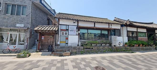 | ▲ 남문골목 사이에 자리잡은 대명헌 대명헌의 입구는 골목사이에 자리잡아 좀처럼 찾기 힘들다. 앞에 보이는 한옥카페는 대명헌의 사랑채로 쓰였다고 한다. |