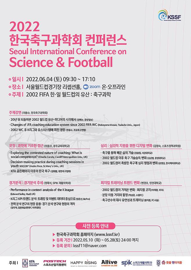 '2002 FIFA 한일월드컵의 유산:축구과학'을 주제로 개최되는 이번 컨퍼런스에는 '20년 뒤 되돌아본 2002월드컵 유산 – 미디어의 시각에서(장혜수 중앙일보 기자), 2002월드컵 이후 JFA 지도자양성 시스템의 변화(나카야마 마사오 일본 츠쿠바대 교수), 2002월드컵 후 K리그와 유스시스템에 미친 영향(한웅수 한국프로축구연맹 부총재)' 등을 주제로 한 강연이 준비돼 있다.