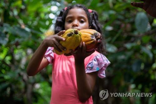 epaselect epa09981284 A girls holds cocoa fruits at a farm in Tacarigua, Venezuela, 27 May 2022. The Venezuela Committee of the World Farmers Organization said they hope to increase cocoa production in the Caribbean country to 60,000 tons within three years, an increase that will be progressive. EPA/RAYNER PENA R