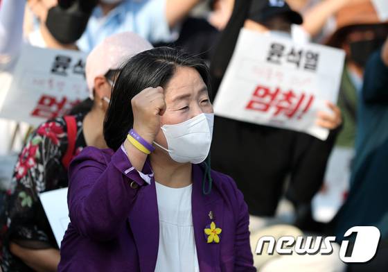 (서울=뉴스1) 구윤성 기자 = 윤미향 무소속 국회의원이 28일 오후 서울 용산구 이태원광장에서 촛불승리전환행동 주최로 열린 윤석열 정부 정책 비판 집회에 참석해 구호를 외치고 있다. 2022.5.28/뉴스1