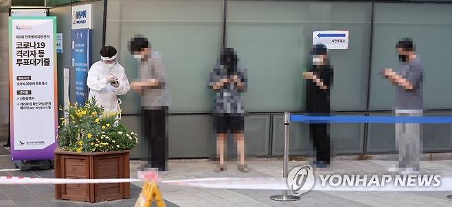 (서울=연합뉴스) 김인철 기자 = 제8회 전국동시지방선거 사전투표 이틀째인 28일 오후 서울 용산구의회에 마련된 사전투표소에서 코로나19 확진·격리 유권자들이 투표를 위해 줄을 서고 있다. 2022.5.28