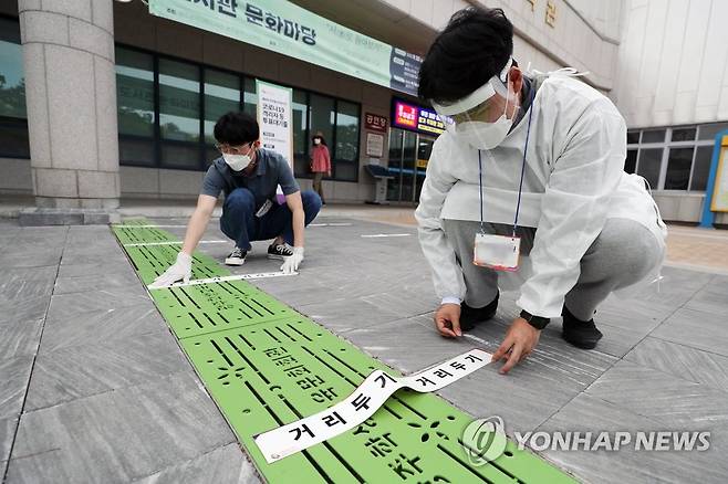 (광주=연합뉴스) 천정인 기자 = 28일 오후 광주 서구 상무1동 사전투표소에서 선거사무원들이 사전투표를 하러 온 코로나19 확진자들의 대기장소를 마련하고 있다. 2022.5.28