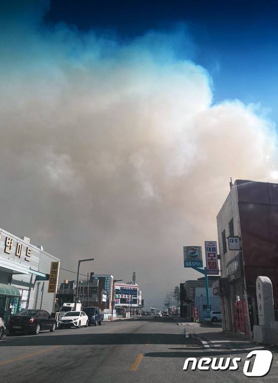 (울진=뉴스1) 정진욱 기자 = 28일 낮 12시쯤 경북 울진군 근남면 행곡리의 한 야산에서 발생한 불이 바람을 타고 울진읍 읍남리 쪽으로 확산되고 있다. 산림당국은 산불전문진화헬기 등 25대와 장비 79대, 공무원 등 200여명을 투입 진화작업을 벌이고 있다.(독자제공)2022.5.28/뉴스1