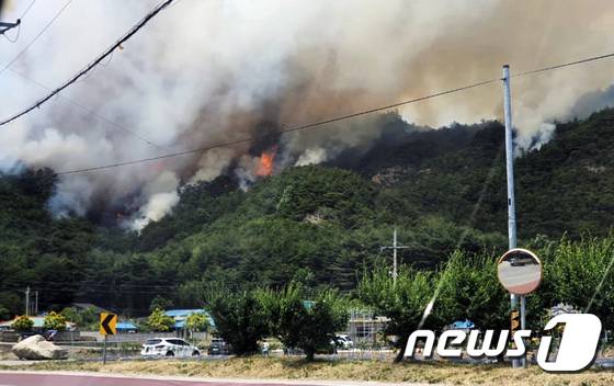 (울진=뉴스1) 정진욱 기자 = 28일 낮 12시쯤 경북 울진군 근남면 행곡리의 한 야산에서 발생한 불이 바람을 타고 울진읍 읍남리 쪽으로 확산되고 있다. 산림당국은 산불전문진화헬기 등 25대와 장비 79대, 공무원 등 200여명을 투입 진화작업을 벌이고 있다.(독자제공)2022.5.28/뉴스1