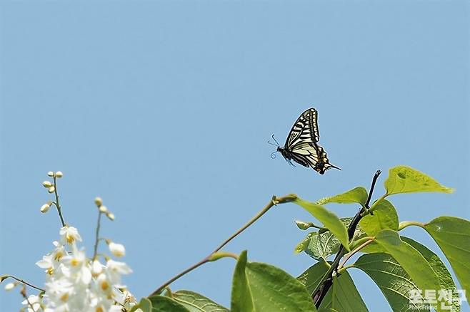 참지 못한 호랑나비가 달려들고 있다.