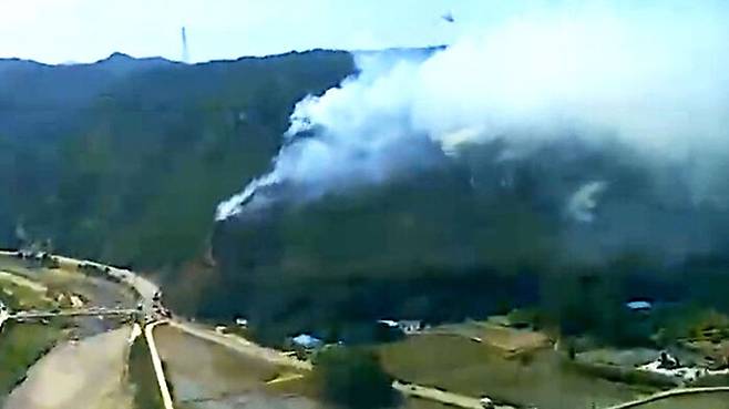 오늘(28일) 오후 경북 울진 수산리를 관통하는 7번 국도 주변이 산불에 휩싸였습니다.