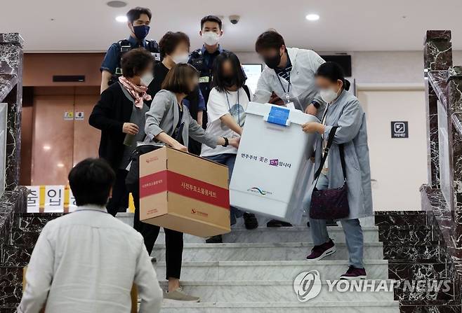 (서울=연합뉴스) 김인철 기자 = 제8회 전국동시지방선거 사전투표 이틀째인 28일 서울 용산구의회에 마련된 사전투표소에서 관계자들이 관내 투표함과 관외사전 회송용봉투를 옮기고 있다. 2022.5.28
