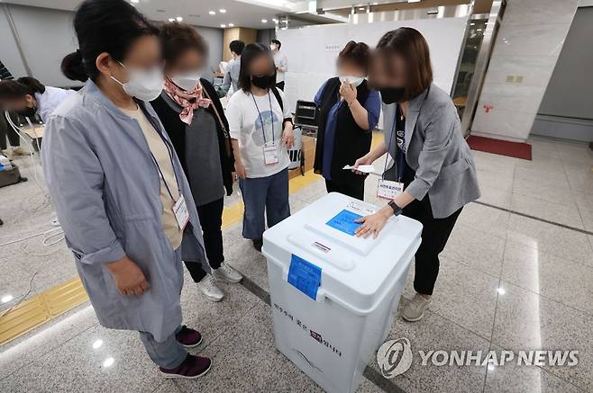 (서울=연합뉴스) 김인철 기자 = 제8회 전국동시지방선거 사전투표 이틀째인 28일 서울 용산구의회에 마련된 사전투표소에서 관계자들이 관내 투표함에 봉인지를 부착하고 있다. 2022.5.28