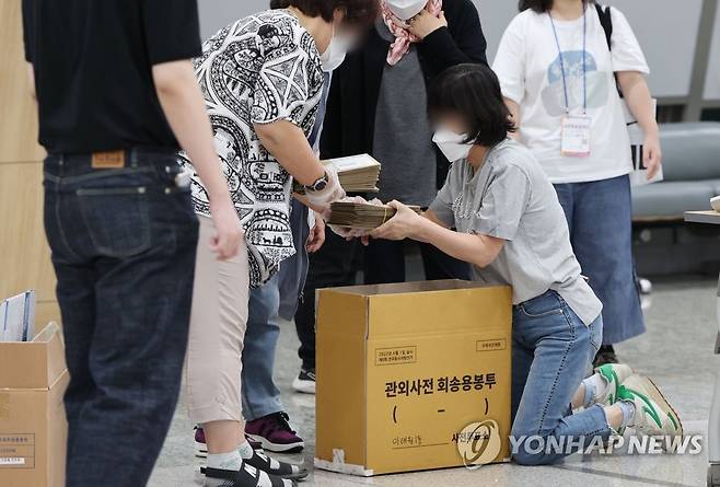 (서울=연합뉴스) 김인철 기자 = 제8회 전국동시지방선거 사전투표 이틀째인 28일 서울 용산구의회에 마련된 사전투표소에서 관계자들이 관외 투표용지를 정리하고 있다. 2022.5.28