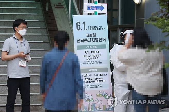 (서울=연합뉴스) 신현우 수습기자 = 6·1 지방선거와 국회의원 보궐선거의 사전투표 이틀째인 28일 오후 서울 중구 다산동 사전투표소에 한 코로나19 확진·격리 유권자가 들어가고 있다. 2022.5.28