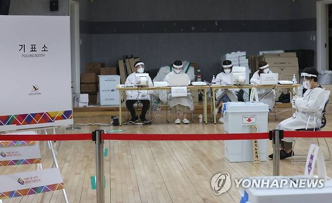 (서울=연합뉴스) 신현우 수습기자 = 6·1 지방선거와 국회의원 보궐선거의 사전투표 이틀째인 28일 오후 서울 중구 다산동 사전투표소에서 관계자들이 코로나19 확진·격리자 사전투표를 준비하고 있다. 2022.5.28