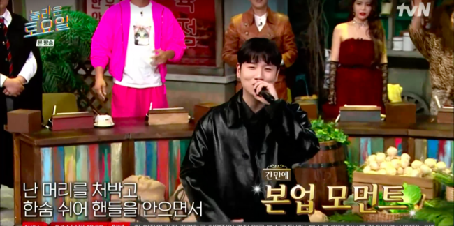 한편, 간식게임으로 ‘노래방 반주 퀴즈’가 출제됐다. 첫 번째로 키가 가볍게 간식게임을 맞추는 것을 시작으로 두 번째로 한해가 다이나믹 듀오 ‘죽일 놈’을 맞췄다. 붐은 넉살과 함께 공연을 요청했고 한해와 넉살은 본업 래퍼의 모습을 보여줬다. 오랜만에 본업에 충실한 한해의 모습에 제작진은 촬영을 하는 등 공연을 방불케 하는 퍼포먼스를 보여주며 주변을 놀라게 했다.