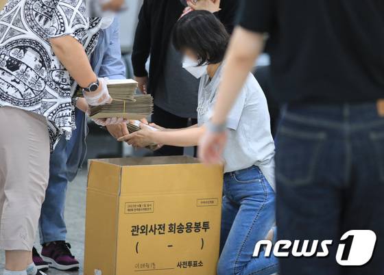 (서울=뉴스1) 구윤성 기자 = 제8회 전국동시지방선거 사전 투표 이틑날인 28일 오후 서울 용산구의회에 마련된 이태원 제1동 사전투표소에서 사무원과 참관인들이 사전투표가 끝난 뒤 관외 사전투표 봉투를 보관 상자로 옮기고 있다. 2022.5.28/뉴스1