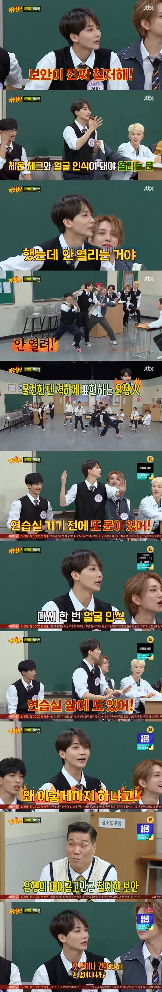 이어 정한은 "그렇게 문을 열고 들어가면 연습실 앞에 얼굴인식이 또 있다. 그리고 들어가면 또 하나의 얼굴인식이 있다. 대체 왜 이렇게까지 하는 거냐? 몇 번이나 건의를 했는데 없어지질 않더라"고 얘기했다.