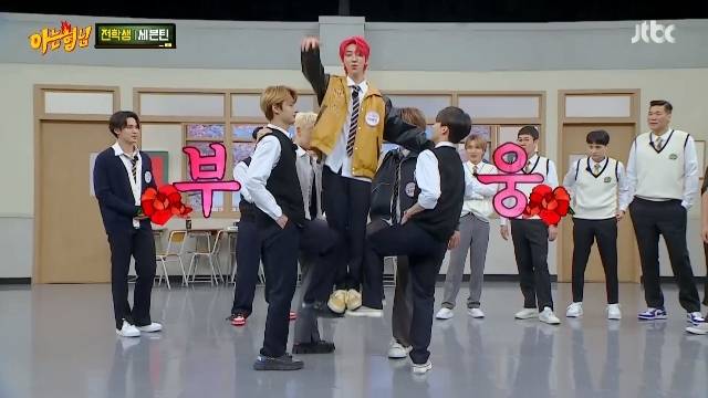 이날 서장훈은 세븐틴 멤버 중 호시가 힘이 좋다는 말에 의아해했다. 이에 호시는 하체 힘으로 하는 안무가 있는데 자신이 그걸 잘 한다면서, 즉석에서 보여주겠다고 나섰다. 멤버 네 명이서 한 다리로만 사람을 드는 안무였다.