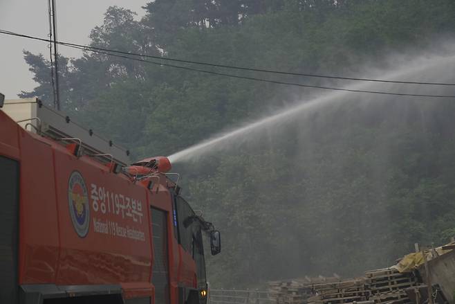 [서울=뉴시스] 조수정 기자 = 28일 경북 울진군에서 발생한 산불과 관련, 소방당국이 민가 방어를 위해 울진읍 읍남리 마을(토일1길)에서 예비주수를 실시하고 있다 (사진=소방청 제공) 2022.05.28. photo@newsis.com