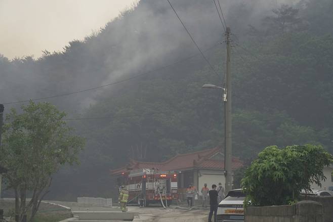 [서울=뉴시스] 조수정 기자 = 28일 경북 울진군에서 발생한 산불과 관련, 소방당국이 민가 방어를 위해 울진읍 읍남리 마을(토일1길)에서 예비주수를 실시하고 있다 (사진=소방청 제공) 2022.05.28. photo@newsis.com