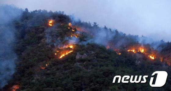 (울진=뉴스1) 최창호 기자 = 28일 오후 경북 울진군 근남면 행곡리 민가 뒷편 산에서 불길이 번지고 있다. 산림당국인 이날 낮 12시쯤 행곡리 인근 산에서 난 불로 산림 110ha가 소실됐다고 밝혔다.2022.5.28/뉴스1