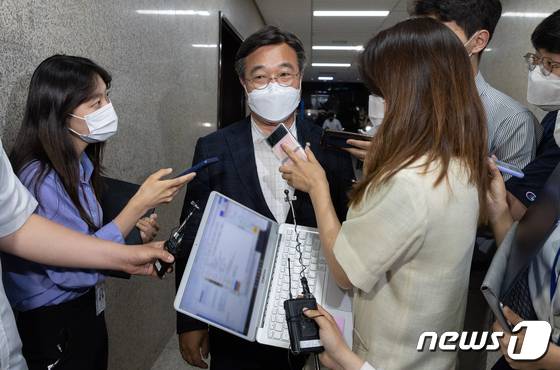 (서울=뉴스1) 이재명 기자 = 윤호중 더불어민주당 공동비상대책위원장이 28일 오후 서울 여의도 국회에서 열린 비상대책위원회 간담회를 마친 후 취재진 질문에 답변하고 있다. 2022.5.28/뉴스1