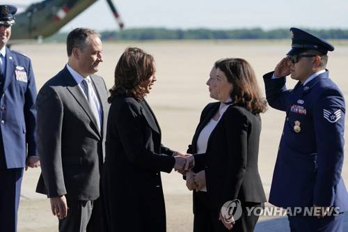 Vice President Kamala Harris shakes hands with New York Gov. Kathy Hochul before boarding Air Force Two, Saturday, May 28, 2022, at Andrews Air Force Base, Md. Harris is en route to Buffalo, N.Y., to attend a memorial service for Ruth Whitfield, a victim of the Buffalo supermarket shooting. (AP Photo/Patrick Semansky)