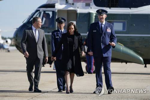 Vice President Kamala Harris walks to board Air Force Two, Saturday, May 28, 2022, at Andrews Air Force Base, Md. Harris is en route to Buffalo, N.Y., to attend a memorial service for Ruth Whitfield, a victim of the Buffalo supermarket shooting. Second gentleman Douglas Emhoff is at left. (AP Photo/Patrick Semansky)