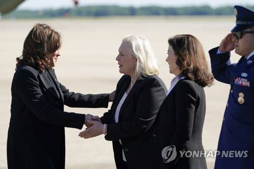 Vice President Kamala Harris shakes hands with Sen. Kirsten Gillibrand, D-N.Y., before boarding Air Force Two, Saturday, May 28, 2022, at Andrews Air Force Base, Md. Harris is en route to Buffalo, N.Y., to attend a memorial service for Ruth Whitfield, a victim of the Buffalo supermarket shooting. New York Gov. Kathy Hochul is second from right. (AP Photo/Patrick Semansky)