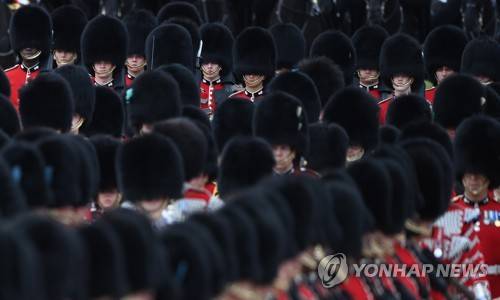 epa09981946 The Household Division, in traditional bearskin hats, take part in The Colonel's Review at Horseguards Parade Ground in London, Britain, 28 May 2022. The Colonel's Review is the final evaluation of the parade before it goes before Britain's Queen Elizabeth during the Trooping of the Colour on the 2nd June 2022 as part of the Platinum Jubilee celebrations. EPA/NEIL HALL