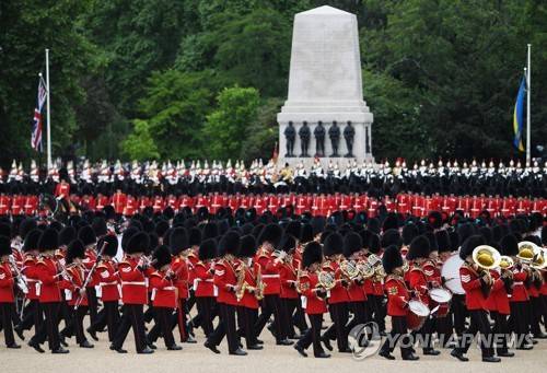epa09981947 The Household Division, in traditional bearskin hats, take part in The Colonel's Review at Horseguards Parade Ground in London, Britain, 28 May 2022. The Colonel's Review is the final evaluation of the parade before it goes before Britain's Queen Elizabeth during the Trooping of the Colour on the 2nd June 2022 as part of the Platinum Jubilee celebrations. EPA/NEIL HALL