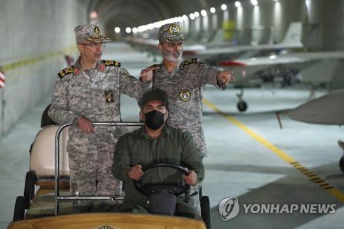 epa09981977 A handout photo made available by the Iranian Army on 28 May 2022, shows Commander-in-Chief of the Iranian Army Major General Abdolrahim Mousavi (R) and Armed Forces Chief of Staff Major General Mohammad Bagheri (L) visiting an underground drone base, in an unknown location in Iran, 19 May 2022 (issued 28 May 2022). EPA/IRANIAN ARMY OFFICE / HANDOUT HANDOUT EDITORIAL USE ONLY/NO SALES