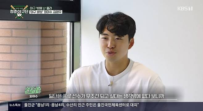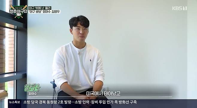 미국에서 태어났다는 김영우는 "만 18세 때 한국과 미국 국적 중 하나를 택해야 했는데 일단은 프로선수가 무조건 되고 싶다는 생각밖에 없으니 한국 국적을 택했다. 미국 국적을 택하면 한국에서는 용병으로밖에 못 뛰니까"라며 군대에 다녀온 이유를 알렸다. (사진=KBS 1TV '청춘야구단' 캡처)