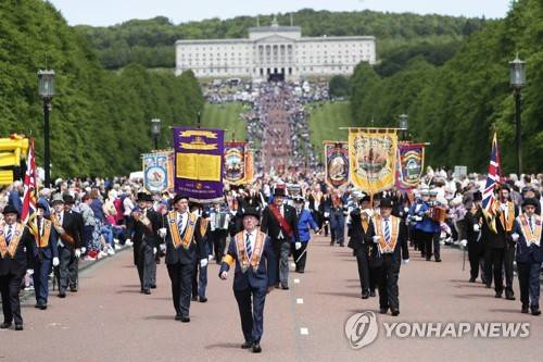 Thousands of members of the Orange Order and bands parade from Parliament Buildings, Stormont, in Belfast, Northern Ireland, Saturday, May 28, 2022. The large parade and spectators marched from Stormont to Belfast city hall to mark the centenary of Northern Ireland. (AP Photo/Peter Morrison)
