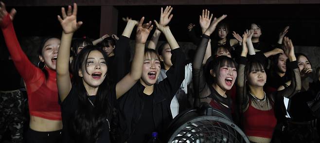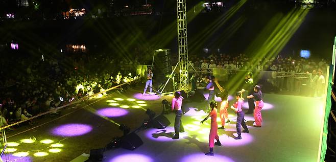 28일 저녁 경남 거창읍 위천천 고수부지에서 코로나19로 3년만에 열린 '2022 제19회 거창군청소년한마음축제'에서 관내 중·고등학생들이 평소 갈고 닦은 댄스 실력을 선보이며 관람객들의 환호성을 이끌어 내고 있다.