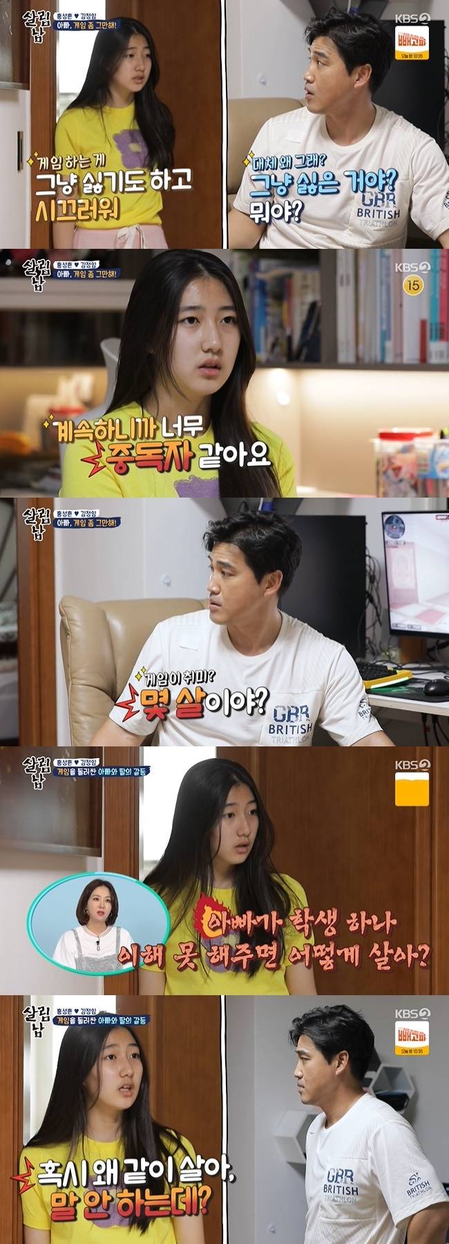 홍화리는 “아빠가 학생 하나 이해 못해주면 어떻게 사나. 딸 생각 못해주면 어떻게 사나”라고 말했고, 뒤늦게 부녀의 고성을 듣고 다가온 김정임도 불만을 토로했다. 홍화리는 “엄마가 얼마나 불쌍한지 아냐. 내가 집에 들어오면 엄마 혼자 거실에 있고 아빠는 맨날 게임을 한다. 혹시 왜 같이 사나. 말을 안 하는데. 뭐하냐 둘이 같이”라며 “아니면 PC방을 가든가. 그냥 내가 스터디 카페를 가겠다”라고 폭발했다.