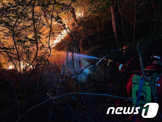 (울진=뉴스1) 최창호 기자 = 산림청 산림항공본부 공중진화대원들이 28일 오후 경북 울진군 근남면에 야간 산불 진화작전을 펼치고 있다.(산림청산림항공본부제공)2022.5.28/뉴스1