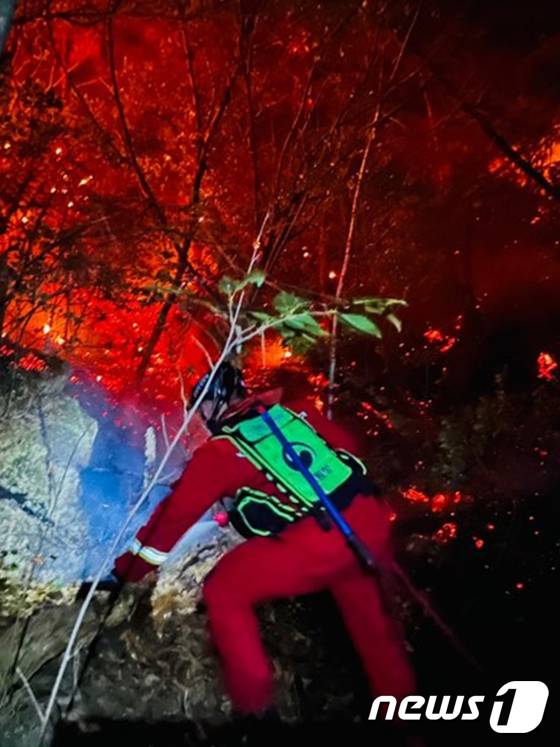 (울진=뉴스1) 최창호 기자 = 산림청 산림항공본부 공중진화대원들이 28일 오후 경북 울진군 근남면에 야간 산불 진화작전을 펼치고 있다.(산림청산림항공본부제공)2022.5.28/뉴스1