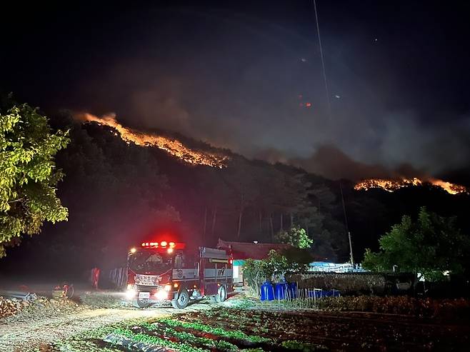 [서울=뉴시스] 조수정 기자 = 28일 경북 울진군 울진읍 행곡2리 야산에서 발생한 산불 현장에서 경북소방본부, 중앙구조본부 등 소방당국이 야간 화재 진압 및 민가 방어 주수를 하고 있다. (사진=소방청 제공) 2022.05.28. photo@newsis.com