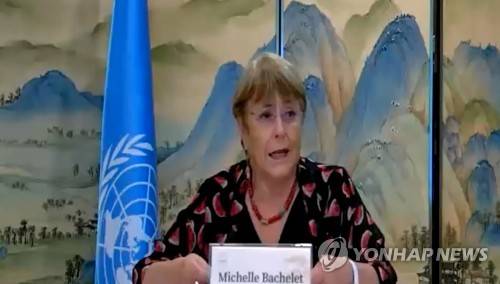 epa09982037 A still image taken from a handout video made available by the Office of the United Nations High Commissioner for Human Rights (OHCHR) shows UN High Commissioner for Human Rights Michelle Bachelet speaking to journalists during a virtual press conference in Guangzhou, China, 28 May 2022. Bachelet concludes her six-day official visit to China on 28 May which includes travel to Guangzhou and Xinjiang region. EPA/OHCHR HANDOUT -- BEST QUALITY AVAILABLE -- HANDOUT EDITORIAL USE ONLY/NO SALES