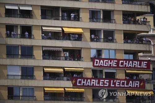 People watch from a building where bannerss are displayed for Ferrari driver Charles Leclerc of Monaco, during qualifying session at the Monaco racetrack, in Monaco, Saturday, May 28, 2022. The Formula one race will be held on Sunday. (AP Photo/Daniel Cole)