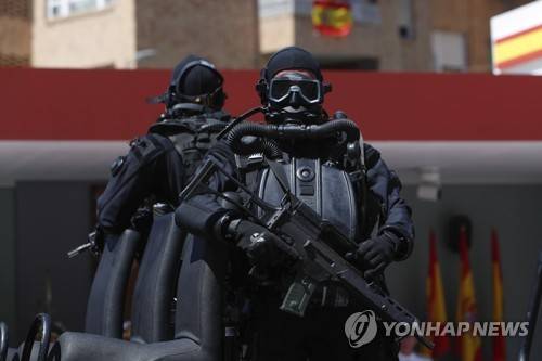 epa09982058 Members of the Spanish Royal Navy during a parade celebrating the Spanish Armed Forces Day in Huesca, northern Spain, 28 May 2022. EPA/JAVIER BELVER