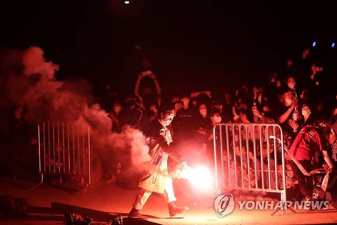 (춘천=연합뉴스) 양지웅 기자 = 28일 오후 강원 춘천시 삼천동에서 열린 2022 춘천마임축제의 주요 공연인 '불의도시; 도깨비난장'에서 출연자가 화려한 불꽃놀이를 선보이고 있다. 2022.5.28