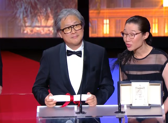 박찬욱 감독은 수상 후 무대에서 "코비드 시대를 겪으면서 우리 인류가 국경을 높이 올릴 때도 있었지만 하나의 단일한 공포와 근심을 공유하기도 했습니다"라며 코로나19 시대의 암흑기를 가장 먼저 떠올렸다.