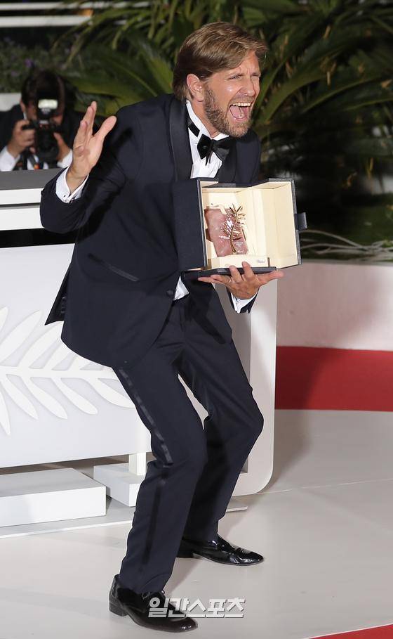 루벤 외스틀룬드 감독이 28일(현지시간) 오후 프랑스 칸 팔레 데 페스티발에서 열린 '제75회 칸 국제영화제'(Cannes Film Festival)에서 황금종려상을 수상 후 세리머니를 하고 있다.