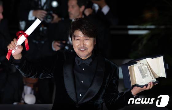 (칸=뉴스1) 이준성 프리랜서기자 = 배우 송강호가 28일(현지시간) 프랑스 칸 팔레 데 페스티벌(Palais des Festivals)에서 열린 '제75회 칸 국제영화제' 폐막식에 참석해 남우주연상 트로피와 함께 포즈를 취하고 있다. 2022.5.29/뉴스1