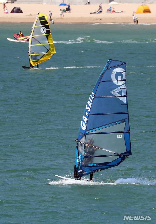 [부산=뉴시스] 하경민 기자 = 더운 날씨를 보인 29일 부산 해운대구 송정해수욕장을 찾은 윈드서퍼들이 힘차게 물살을 가르고 있다. 2022.05.29. yulnetphoto@newsis.com