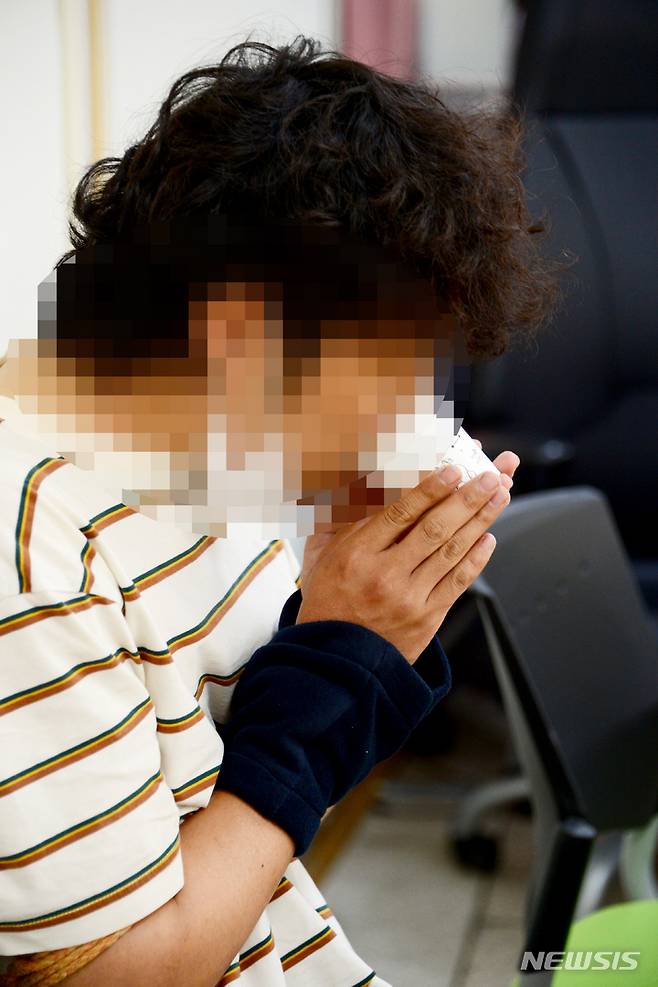 [남해=뉴시스] 차용현 기자 = 29일 오전, 자신의 부모 소유의 건물에서 친 어머니를 살해한 혐의로 구속된 A(37)씨가 경남 남해경찰서에서 경찰 조사를 받던 중 형사가 건넨 물을 마시고 있다. 2022.05.29. con@newsis.com