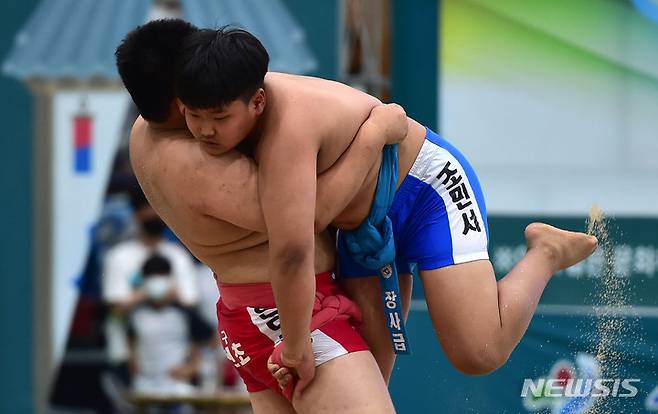[구미=뉴시스] 이무열 기자 = 29일 경북 구미시 경운대학교 체육관에서 열린 '제51회 전국소년체육대회' 초등부 씨름 경기가 펼쳐지고 있다. 2022.05.29. lmy@newsis.com