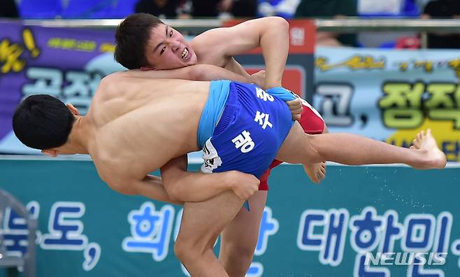 [구미=뉴시스] 이무열 기자 = 29일 경북 구미시 경운대학교 체육관에서 열린 '제51회 전국소년체육대회' 중등부 씨름 경기가 펼쳐지고 있다. 2022.05.29. lmy@newsis.com